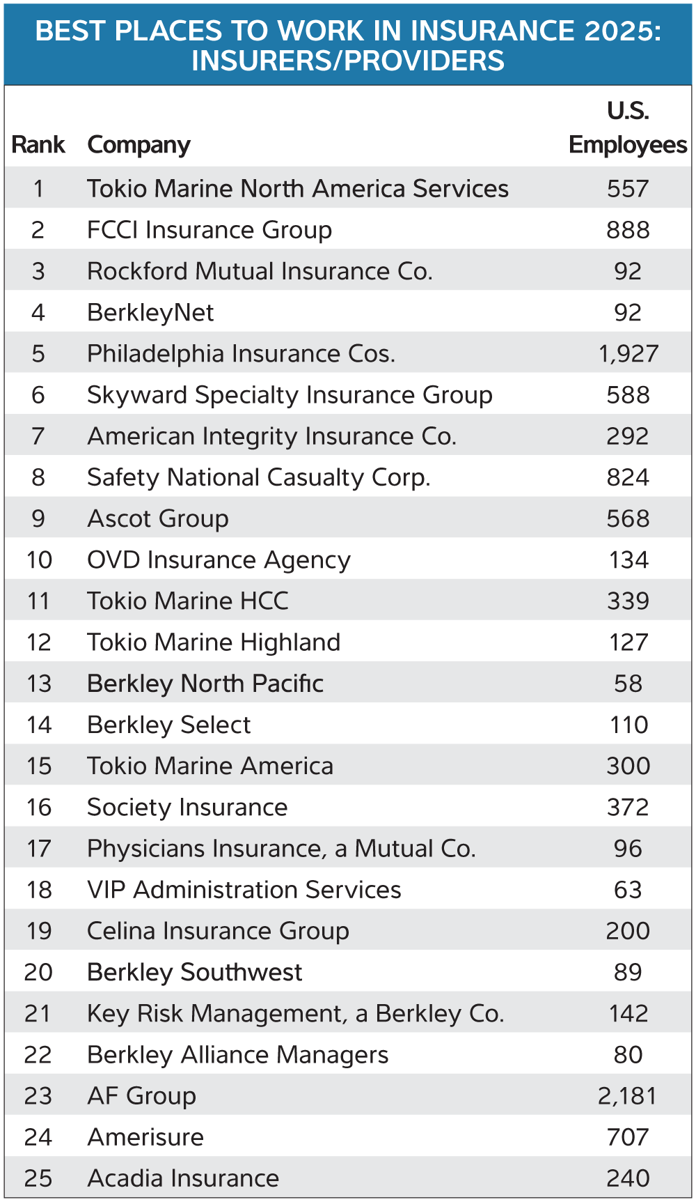 Best Places to Work in Insurance is an annual feature presented by Business Insurance and Best Companies Group that ranks the agents, brokers, insurers and other providers with the highest levels of employee engagement and satisfaction.